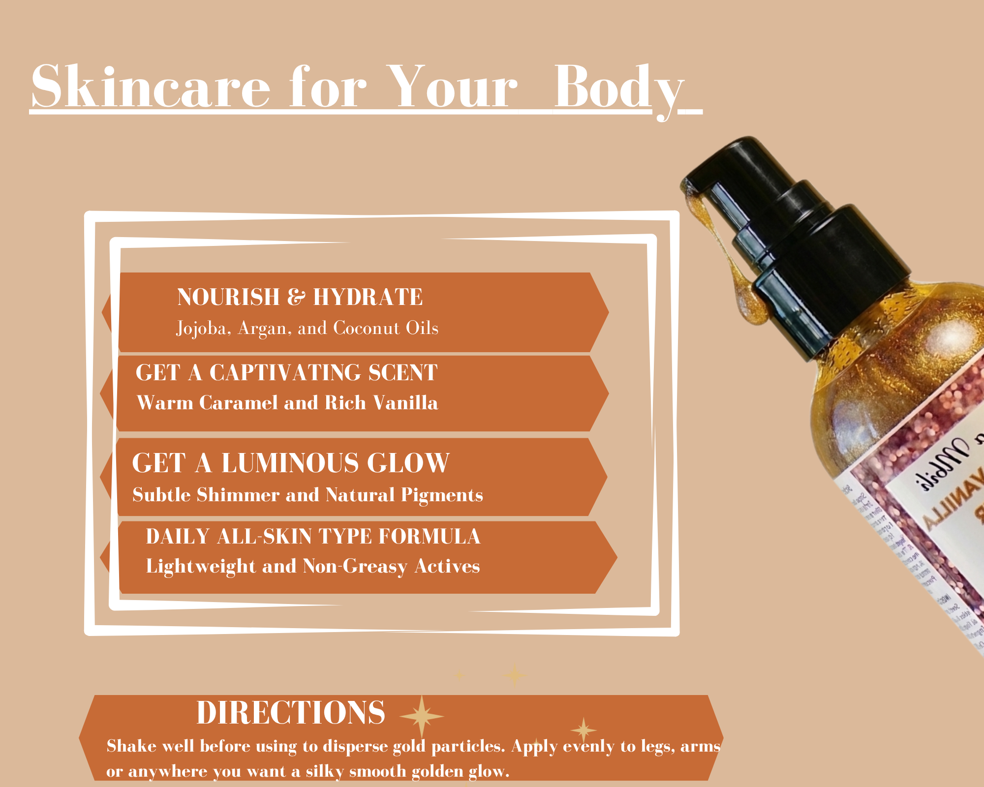 Natural Radiance: Infused with shimmering minerals, our body oil enhances your skin with a subtle, radiant glow that catches and reflects light beautifully.